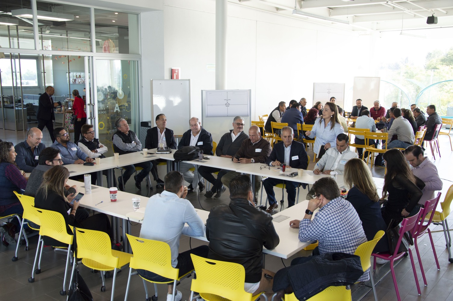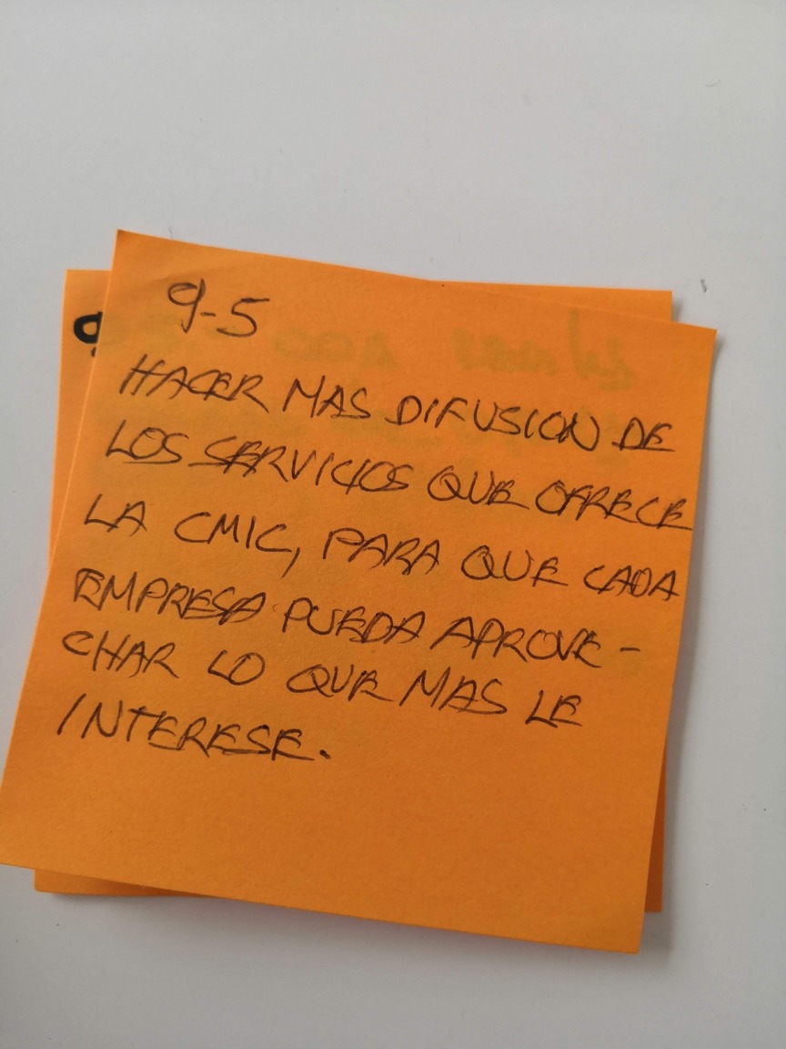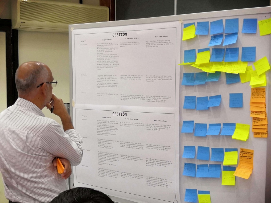 Para comenzar el proyecto, se llevó a cabo una sesión de Empatía en la cual se convocaron a 150 afiliados para obtener sus expectativas y frustraciones en torno a su membresía con la CMIC. Escuchar a los miembros nos permitió entender a profundidad el contexto de la cámara y la manera en la que ésta se percibe . Durante este evento, se indagó sobre los factores clave en torno a la comunicación, la gestión, la representación y los servicios que se ofrecen, que en conjunto, conforman los 4 pilares de la organización. Esta información nos permitió encontrar oportunidades a innovar. Para trabajar éstas necesidades, se realizó una sesión de cocreación con los 20 miembros del comité en donde se formularon ideas en torno a los hallazgos obtenidos anteriormente. En esta dinámica colaborativa se formularon +700 soluciones que formaron parte de la experiencia total del usuario y con las que después construimos un modelo de servicio de alto impacto en la organización.