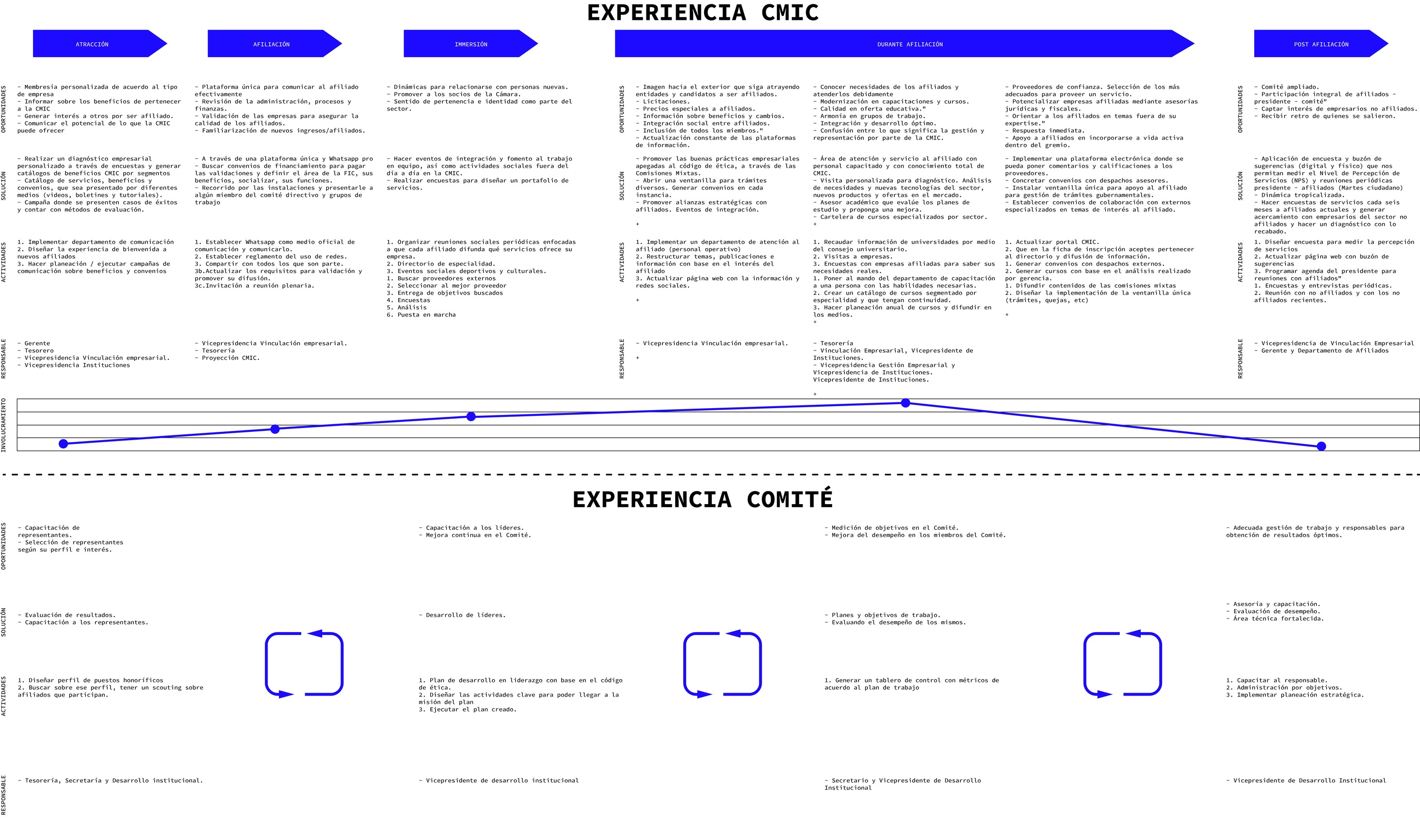 Se creó una experiencia total para el usuario que será vivida a través de los 4 pilares clave de la organización. Asimismo, se aterrizó cada punto de contacto a un tablero de control y seguimiento SMART para que los responsables pudieran medir el desempeño de la organización a lo largo de los próximos 3 años. Ésta solución estará siendo implementada durante la gestión del 2020 al 2023 y ha pasado a ser un hito en la historia de la CMIC ya que nunca se había realizado algo similar en presidencias pasadas.